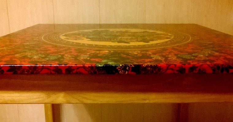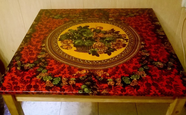Вот в принципе и все. Дело не сложное, минимум материалов. Результат мне нравится, пользуемся столом около года, лак на месте, изменений нет. Ну конечно без фанатизма, сковороду с плиты лучше не ставить. Или использовать ланчматы, уж их-то такое разнообразие!..
