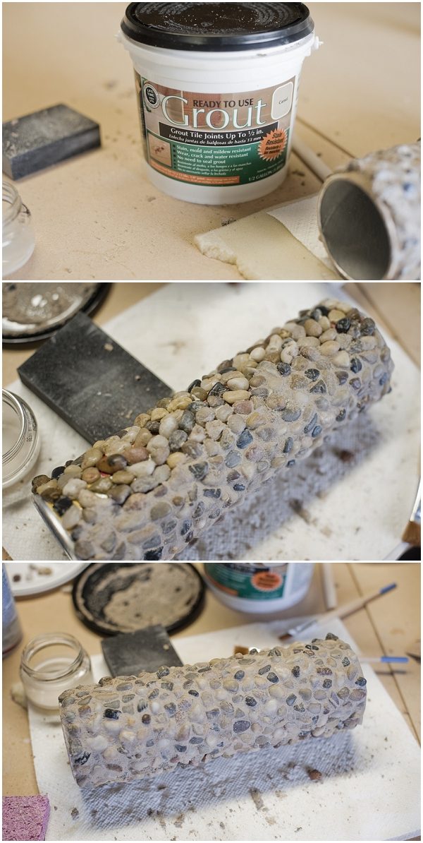 Снаружи баночку обмазываем клеем и приклеиваем к ней камушки. После того как вся банка будет обклеена галькой, разводим затирку и начинаем наносить на вазу.