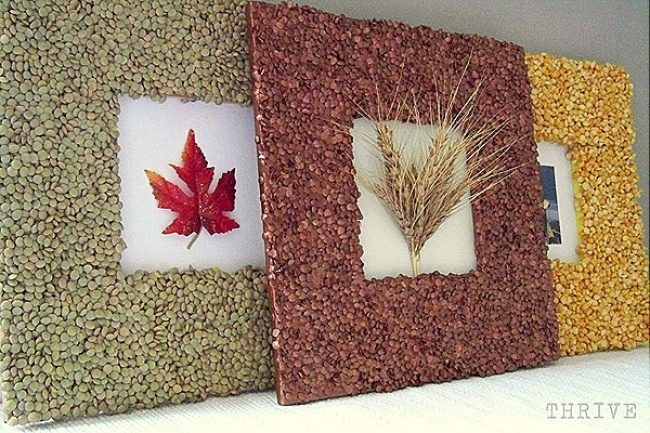 Украшением для вашей рамки может послужить чечевица и другие крупы или косточки. Как это сделать, вы можете посмотреть здесь. А еще можно сделать ароматную рамку из зерен кофе и палочек корицы.