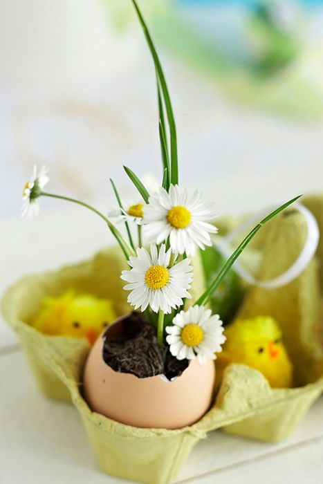 Все привыкли к тому, что пасхальный интерьер украшают цветными куриными яйцами. Но более оригинально смотрятся мини-вазы из яичной скорлупы. В них можно поставить ромашки, тюльпаны или зелень, а сами «вазочки» установить в лотки. Такая композиция отлично дополнит праздничный стол или станет уместным декоративным элементом в прихожей или гостиной.