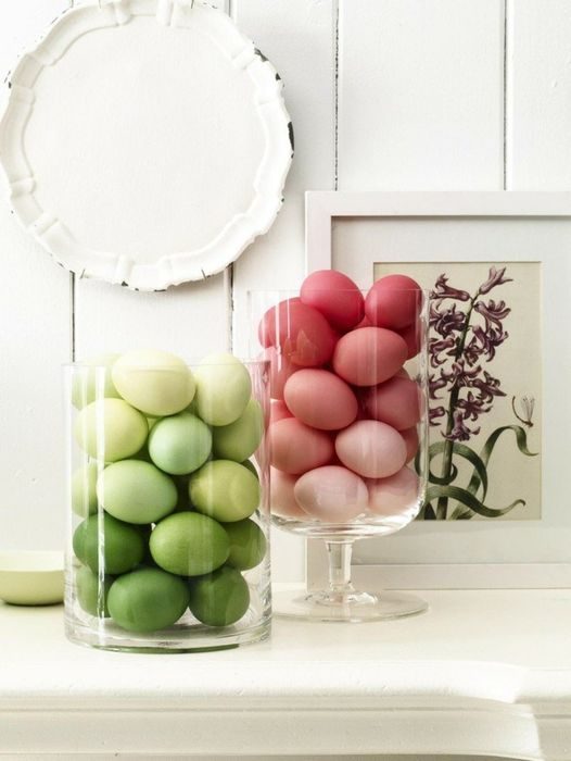 Если хочется декорировать интерьер лаконичными и стильными элементами, то для этого достаточно покрасить определённое количество яиц в один оттенок, но с разной степенью яркости, чтобы создать эффект омбре. Затем понадобится поместить получившиеся яйца в прозрачный сосуд и поставить элемент декора на видное место.