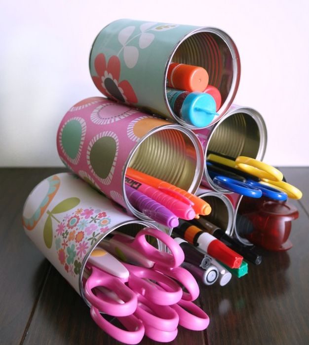 Металлические банки из-под оливок, кукурузы или горошка также могут пригодиться в хозяйстве. Например, если перекрасить их и склеить между собой, то получится симпатичный органайзер для хранения канцтоваров.