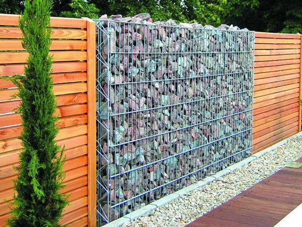 Такой забор вокруг клумбы обречен привлекать к себе внимание, хотя, как видите, сделано все просто. Главное, чтобы проволочная сетка выдержала вес камней, которые ее заполняют. Камни должны быть крупными, грубыми и бесформенными.