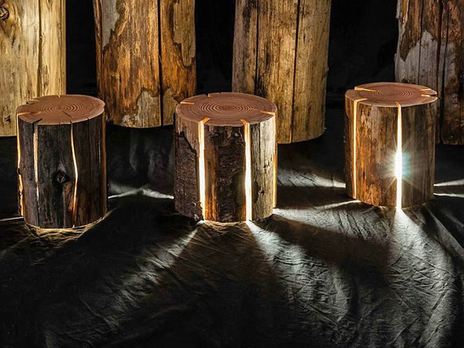 Пни в интерьере могут служить необыкновенными светильниками. Дункан Мирдинг (Duncan Meerding), слабовидящий дизайнер и художник из Австралии, создает уникальные системы освещения из распилов дерева. Внутрь деревянного чурбана со сквозными трещинами помещаются светодиодные лампы, излучающие теплый свет. Такие светильники из пней могут одновременно служить и столиками, и тумбами, и табуретками. Особенно актуально использование такого многофункционального предмета интерьера в спальне, где приглушенное освещение будет выполнять роль ночника.