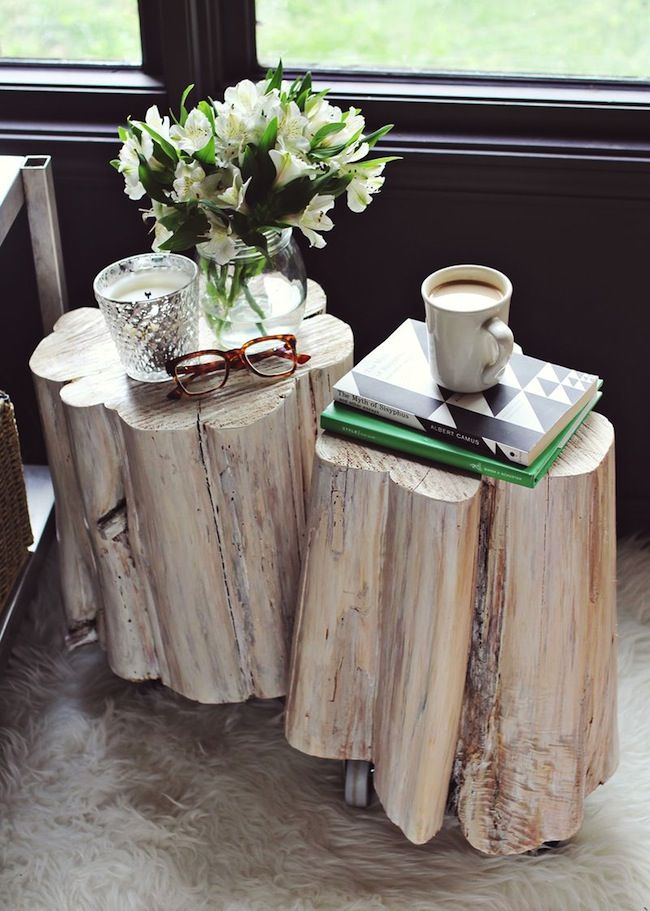 Пни — великолепный материал для того, чтобы сделать своими руками стильную, недорогую и совершенно уникальную мебель, ведь в природе нет двух абсолютно одинаковых деревьев. Подобная мебель из пней впишется практически в любой интерьер, будь-то легкая классика или кантри, скандинавский стиль или минимализм, лофт или индастриал. Если пень окрасить в глянцевые или металлические оттенки, то даже хай-тек может органично вместить такой предмет. Обработанный спил ствола дерева или пенек может стать удобным журнальным столом в гостиной, прикроватной тумбой в спальне, табуретами на кухне или столиком в ванной. Чаще всего в интерьере пень используется в роли именно тумбы или столика.