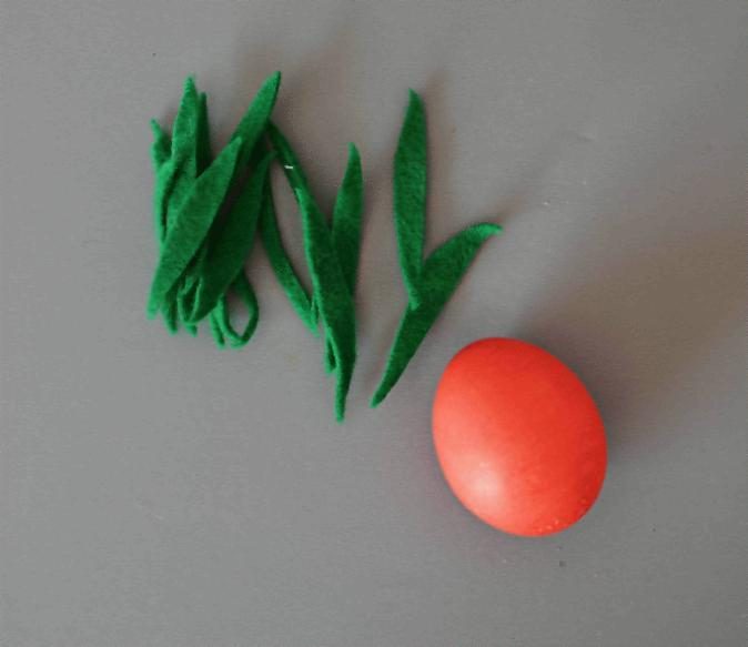 Покрасьте яйца в оранжевый цвет. Из зеленого фетра нарежьте тонкие длинные полоски. Приклейте их сверху, так чтобы листики торчали вертикально.