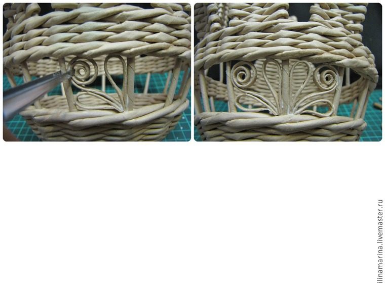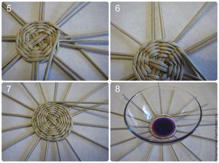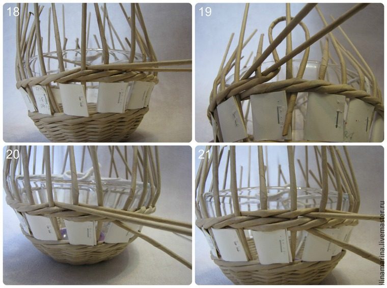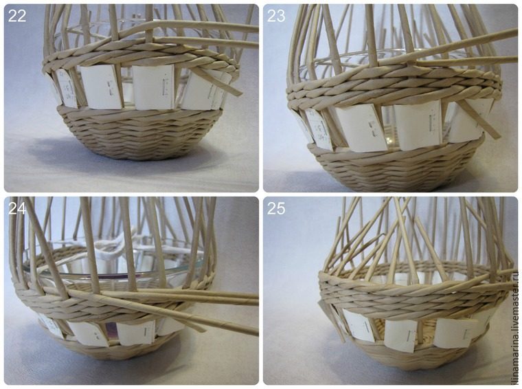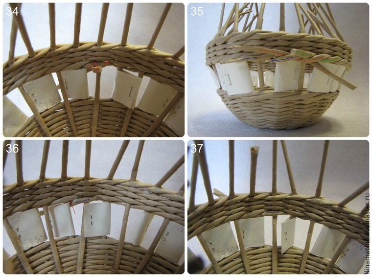 60. Когда доплели ручку до нужной длины, промазываем стойки клеем очень тщательно и протаскиваем на место стоек с противоположной стороны так, чтобы стойки от чаши остались с изнанки, далее их обрезаем. Протаскиваем ручку на все четыре ряда, а снизу лишнее просто обрежем.