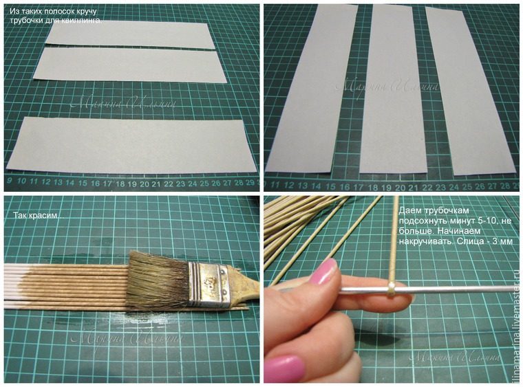 Далее даем немного подсохнуть нашим трубочкам, но недолго, 5-10 минут, главное чуть-чуть подсушить кончики, чтобы они склеились. И начинаем накручивать на толстенькую спицу, у меня она 3 мм.