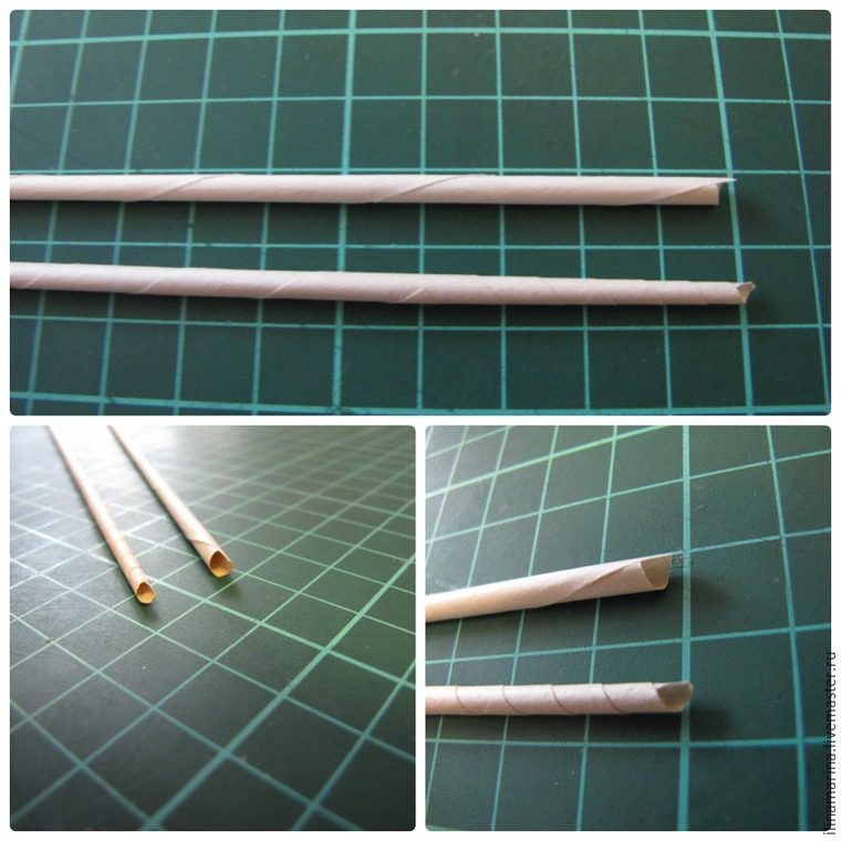 Режу вдоль на 4 полосы. Ширина полоски 7,5 см, спица 1,5 мм. Кручу очень плотно, трубочки получаются одинаковой толщины по все длине. Уже только самый кончик. На фото видно оба конца трубочки. Склеиваю трубочки либо клей-карандашом, либо пва с первого фото. С ПВА нужно быть очень аккуратным, т.к. если будете пачкать трубочку, в этих местах потом будут непрокрасы (это для самых новичков).