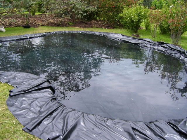 После того, как вы сделали нужную ямку, нужно накрыть её материалом, не пропускающим воду (например, есть специальный геотекстиль). Материал должен быть больше границ вашего вырытого пруда, чтобы была возможность прикрепить его камушками, садовыми скульптурами, клумбами, фантанчиком или чем-нибудь другим на ваш выбор.