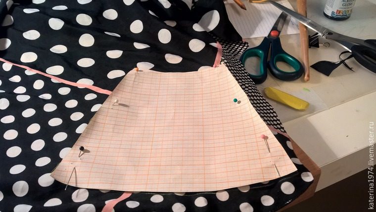 Далее в верхней части намечаем середину и откладываем вниз 1 см. внутрь выкройки. При помощи лекала, циркуля или рук соединяем. То же с нижней частью — намечаем середину, откладываем за границу фактической длины сегмента 1 — 1,5 см и при помощи лекала, циркуля или рук соединяем. Вырезаем. Накалываем на ткань и, уже с припуском на швы (боковые я брала — 1 см, верх — 2 см, низ — 3 см. — для регулировки посадки на каркасе) вырезаем.