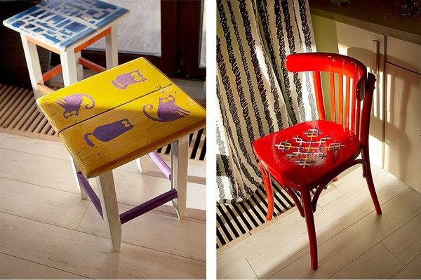 Старые стулья и табуреты могут превратиться в очень яркие и стильные элементы декора