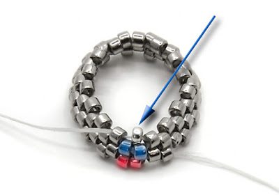 5. Переводим иглу на первый ряд через соседнюю бисерину, развернувшись на 180 градусов.