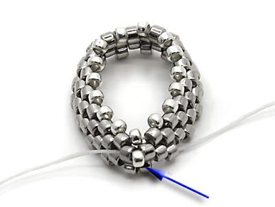 19. Берем круглый бисер 15/0 и проплетаеммозаичным плетением еще один ряд, не забываем стягивать нить.