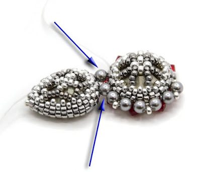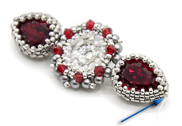 11. Проплетаем круглой пятнашкой второй ряд, не забываем стягивать ряды, ряд завершаем одной бисеринкой во внутреннем уголке, на которую указывает стрелка. На этом этапе кристалл уже хорошо держится и дальнейшие действия нужны для красоты обратной стороны серег, а так же для защиты фольгированного слоя кристалла от царапин и падения.