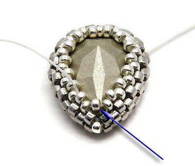 9. Начинаем оплетать изнанку. Переводим нить на обратную сторону и уже можем примерить капельку Сваровски в оправу.