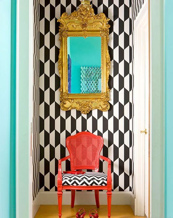 Это наглядный пример того, как старый стул может заиграть новыми красками. В оригинале у него была довольно скучная и не очень привлекательная обивка. Дело спасли красная краска и обивка с геометрическим рисунком. Благодаря такому смелому сочетанию, стул с лёгкостью вписался в гламурный интерьер.