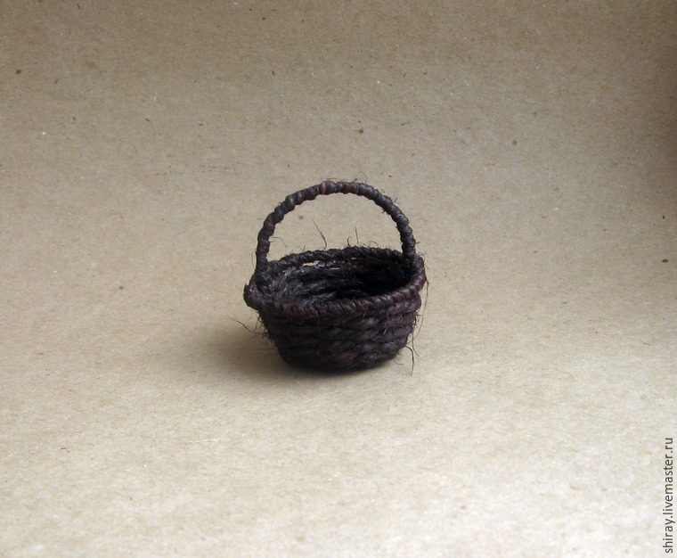Льняной шнур окрашиваем коричневой акриловой краской. Кончик шнура закрепляем на донышке при помощи клея и обматываем между прутиков до необходимой высоты корзинки. Край закрепляем клеем.