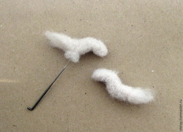 Одновременно между пальцами сваляем (игла №36) две колбаски — передние лапки.