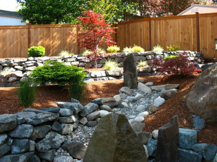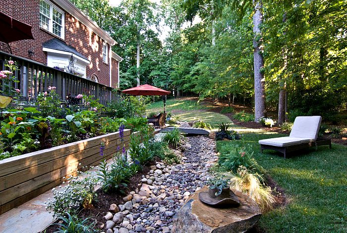 Стильная и оригинальная идея для сада — создание небольшого сухого ручья из камней.