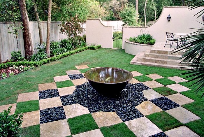 Чудесная площадка, похожая на шахматную доску, сделанная из бетонных плит, газона и темной гальки. В центре площадки, расположена роскошная чаша, из которой непрерывно течет вода.