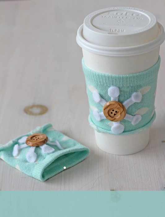 Чтобы горячий кофе или чай не обжигали руки, для чашки можно сделать симпатичную одёжку из одинокого носка. При желании его можно украсить какой-нибудь вышивкой или аппликацией.