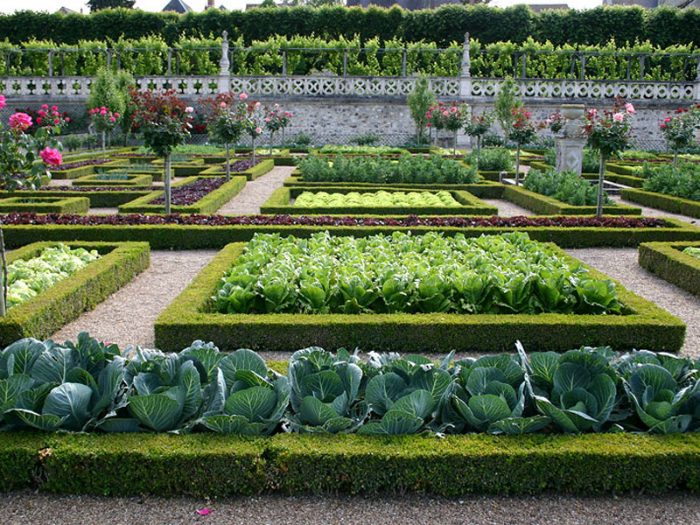 Великолепная композиция из аккуратных симметричных грядок, огражденных низкими бортиками.
