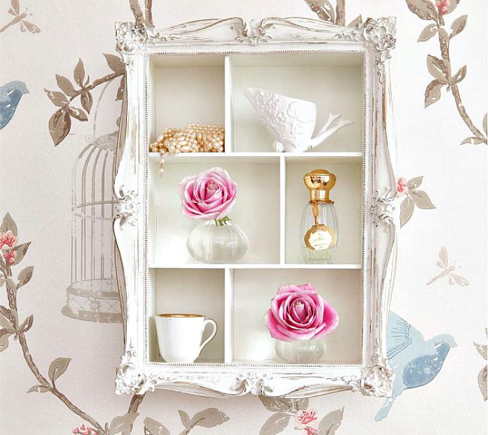 Очаровательная декоративная полка, украшенная искусственно состаренной рамой.