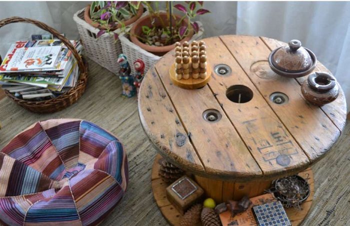 Деревянный стол-катушка украсит любой интерьер комнаты, создаст яркую и уютную атмосферу.