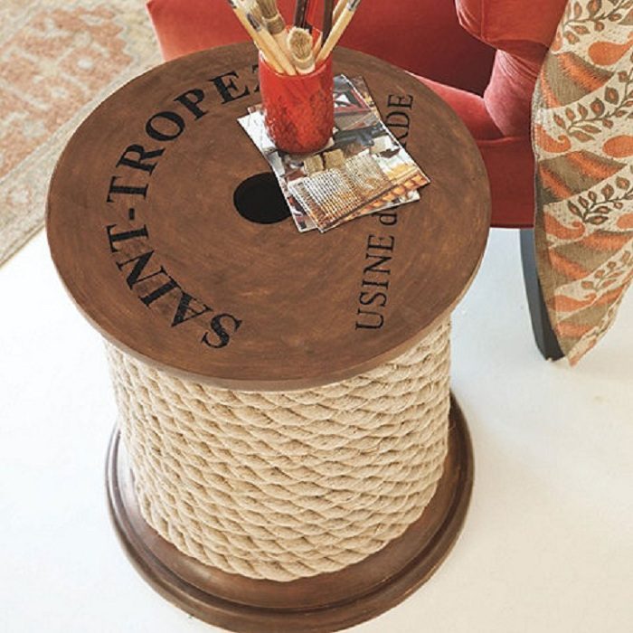 Стол-катушка обернут веревкой и дополнен стеклянной крышкой.