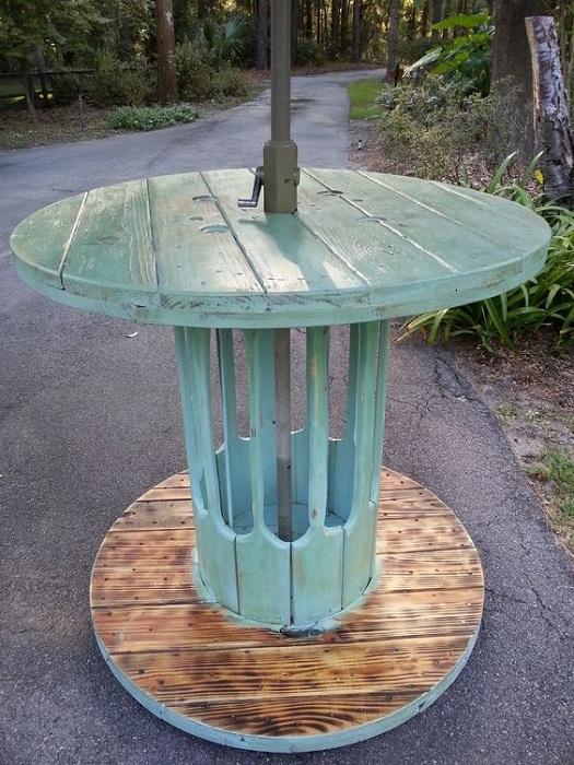 Винтажная конструкция катушки-стола подойдет для оформления дизайна любого открытого пространства около дома.