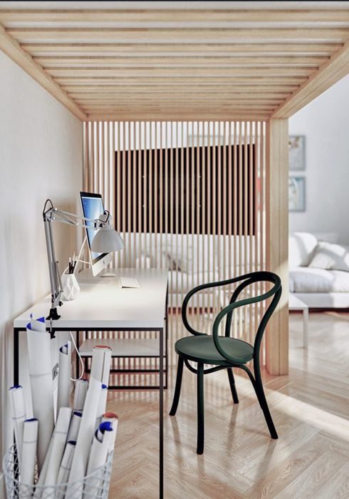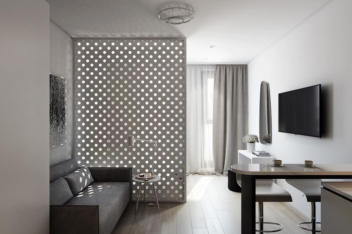 В этом интерьере всё просто и лаконично. Для всего пространства выбрана одна цветовая гамма – серая. Она дарит чувство спокойствия и гармонии. Спальное место расположили у окна, а отделили эту зону с помощью фанерной перегородки. чтобы полностью не перекрывать естественное освещение, в перегородке сделали отверстия, которые пропускают свет. Так получилось создать интимную зону спальни, но и облегчить интерьер.