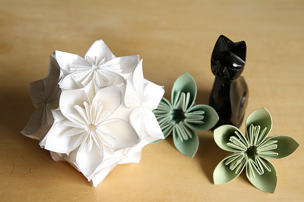 После того, как у Вас будут готовы двенадцать цветов, можете сделать кусудама шар из цветов. Он изготавливается из двух половин по шесть цветов.