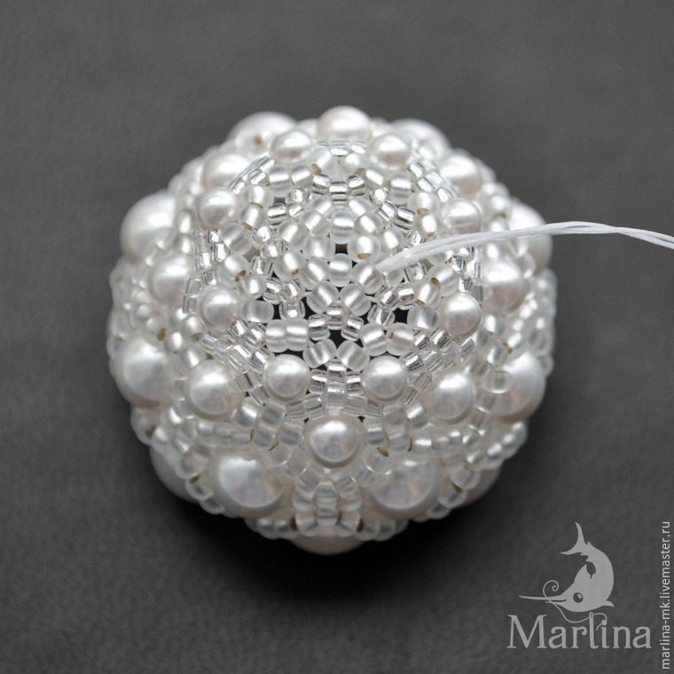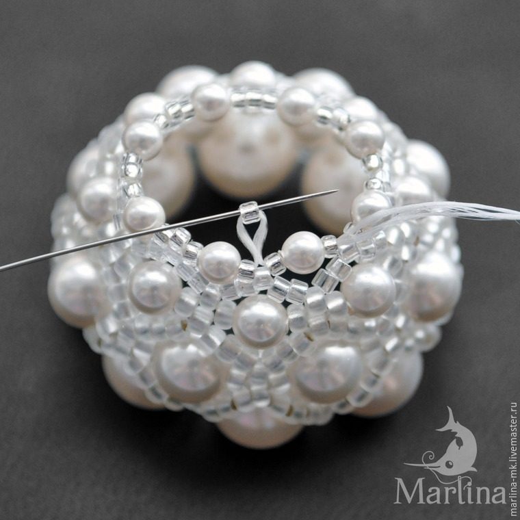 Шаг 2. Между бисеринами предыдущего ряда вплетаем по 9 бисерин Miyuki. Бисерины должны распологаться с одной стороны над каждой жемчужиной.