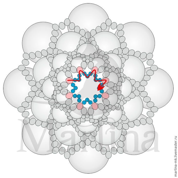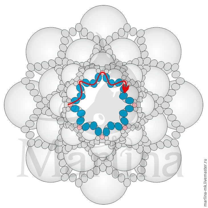 Жемчуг Swarovski 3 мм цвет white — 1 шт.Бейл для кулона — 1 шт.Цепочка с замком — 1 шт.На схемах новый ряд (бусины и бисер) изображен синим цветом, а предыдущие ряды серым. Бисер и бусины предыдущего ряда, через которые проходит нить, отмечены красным цветом. Движение нити обозначено красной стрелкой.