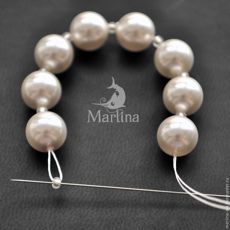 Шаг 1. Отрезаем нить, надеваем одну бисерину Miyuki на нить, затем оба конца нити продеваем в ушко иглы. Набираем на нить поочередно 8 жемчужин 8 мм и 7 бисерин Miyuki. Замыкаем нить в кольцо, пройдя в первую набранную бисерину.