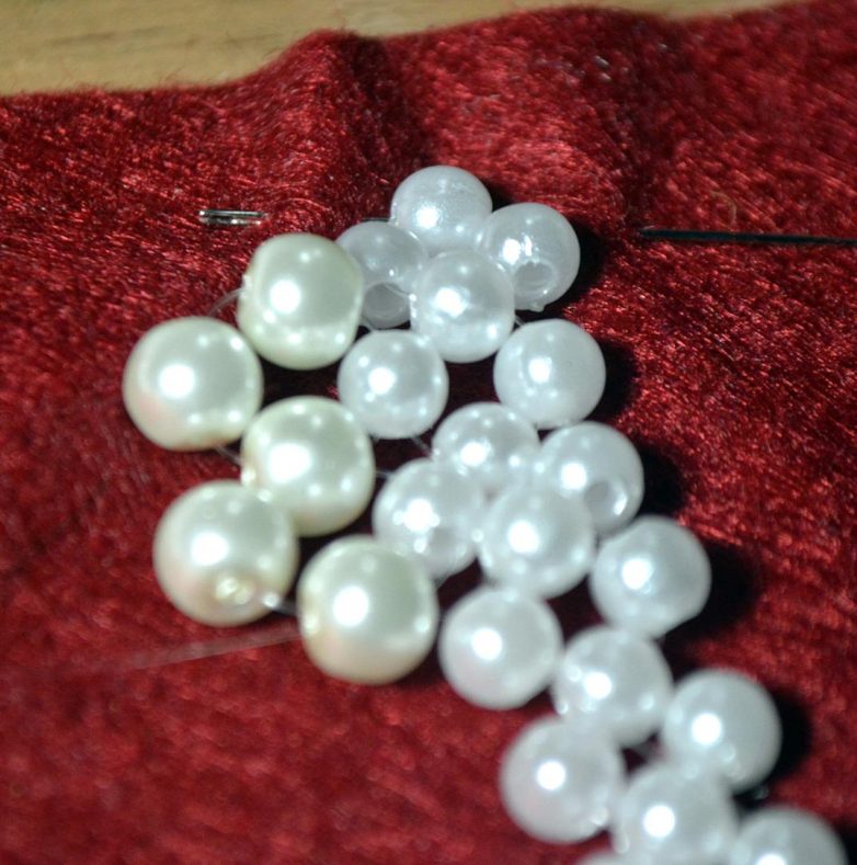 Шаг 2. На каждую иголочку нанизываю по одной бисеринки. Потом нанизываю ещё одну и прохожу сквозь неё иголочками с двух сторон.
