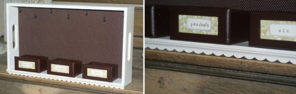 Поднос покрасьте белой краской, дно обтяните тканью и сверху прикрутите крючки для украшений. При желании, Вы можете дополнительно украсить поднос, приклеив снизу выкрашенные в белый цвет пенопластовый декоративный карниз (купить его можно в любом строительном магазине).
