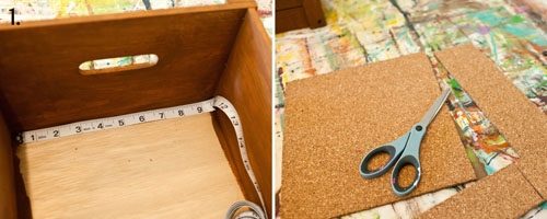 1: Замерьте длину и ширину дна ящика (с внутренней стороны) и отрежьте кусок пробкового коврика соответствующего размера.