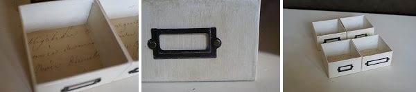 Деревянные (или картонные) ящички для украшений покройте их полупрозрачной глазурью для декупажа. На дно приклейте упаковочную бумагу, а в специальные держатели вставьте этикетки.