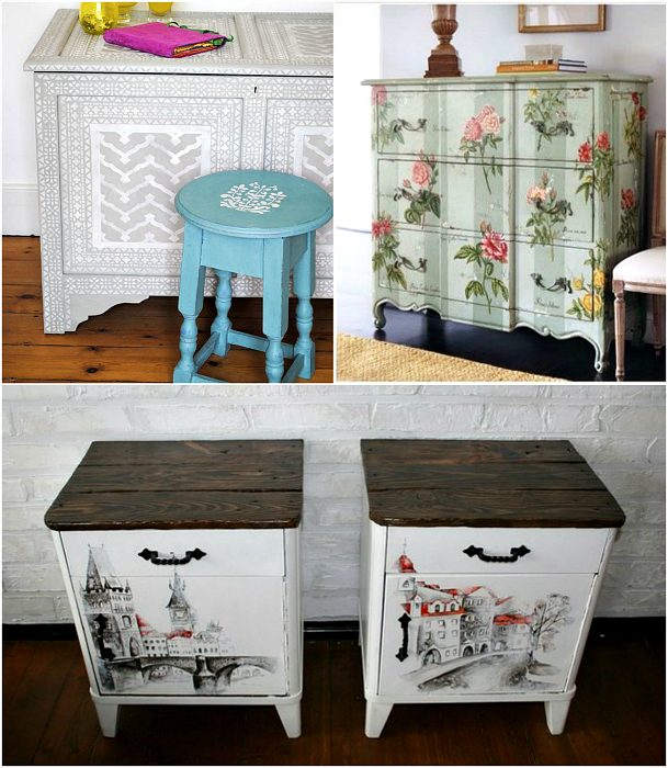 Не спешите выбрасывать старую мебель. Запаситесь цветной бумагой, краской, тканями, виниловыми наклейками и собственной фантазией, чтобы превратить потертую мебель в стильные и уникальные предметы интерьера.
