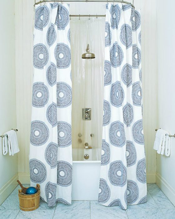 Выбирая шторку для ванны лучше отдать предпочтение длинной. Длинная штора сделает ванную комнату утонченной и создаст иллюзию высокого потолка.