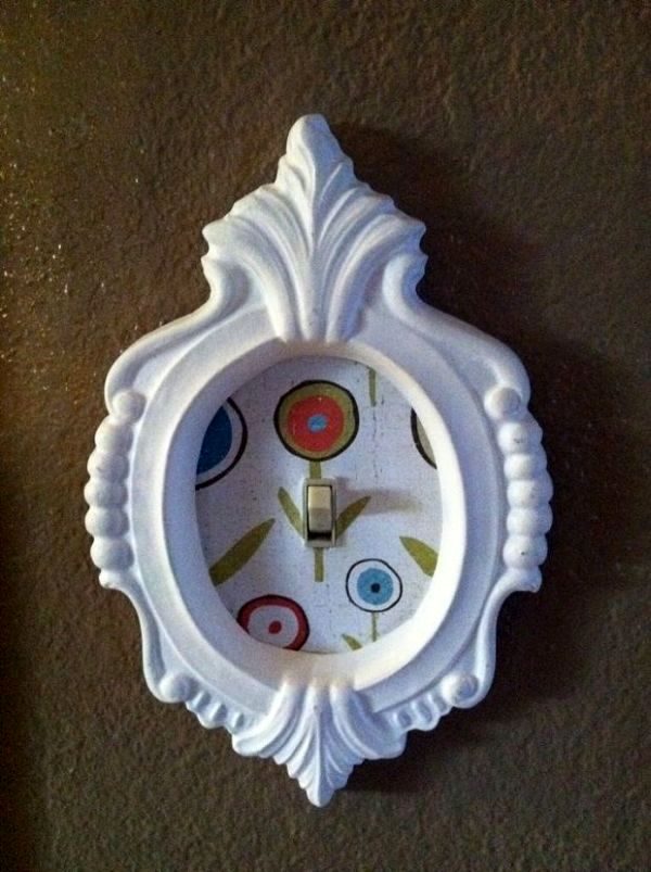 Один из самых простых и дешевых способов украсить выключатели освещения — использовать молдинг или небольшую раму для картины и фотографии. Раму можно приклеить к стене или прибить гвоздями/прикрутить шурупами.