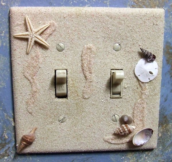 Добавьте немного летнего настроения в интерьер комнаты. Покройте поверхность выключателя клеем, а затем обильно посыпьте мелким песком. По углам можно наклеить мелкие ракушки, морские звезды и бусины под жемчуг.