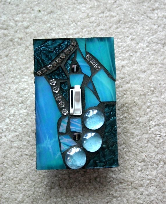 Вы можете украсить выключатели мозаикой из разбитых тарелок и чашек, плитки, стеклышек и бусин.