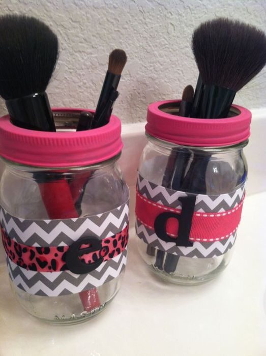Девушки часто сталкиваются с тем, что хранить кисти для макияжа совсем неудобно в чехлах, в которых они изначально продаются. Особенно, некомфортно сушить их после мытья. Для хранения таких принадлежностей отлично подойдёт стеклянная банка, которую при желании можно украсить декоративной бумагой.