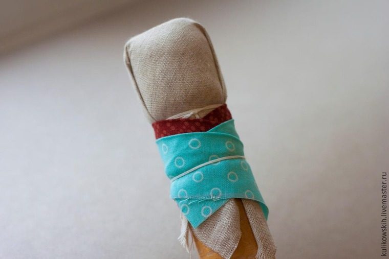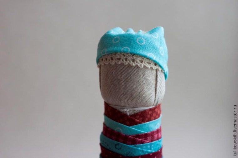 На голову куколки повязываем платок. Чтобы куколка была понаряднее можно использовать несколько «платочков».