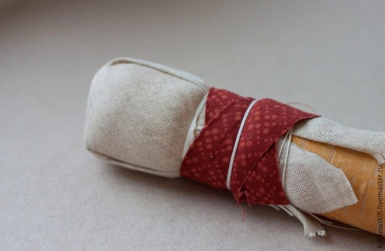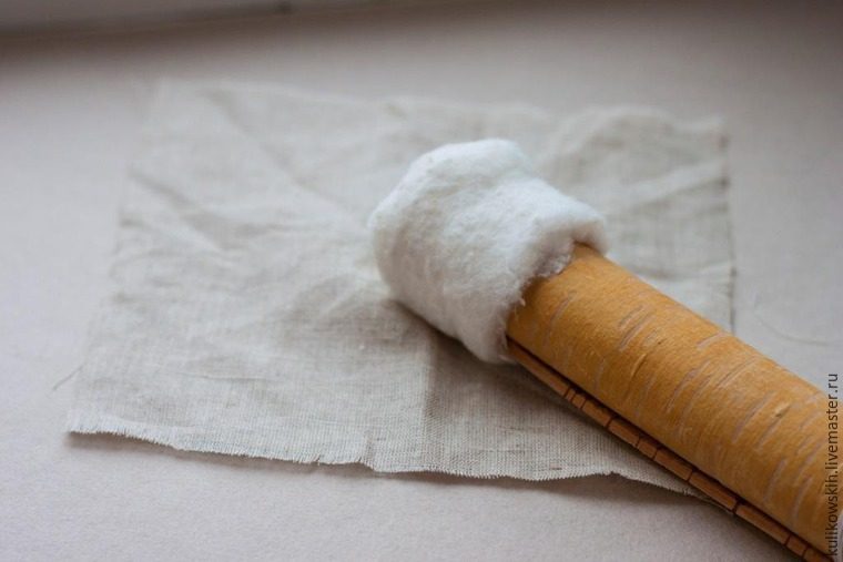 Из бересты вырезаем заготовку примерно 10*20 см и скрутите ее в трубочку. На верхнюю часть наложите небольшой слой ваты или очеса льна.
