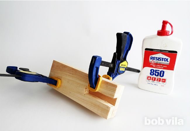 ⇒ Шаг 3. Приклейте дощечку с вырезанным отверстием сверху к сплошному бруску такого же размера. Зафиксируйте в тисках и оставьте высыхать как минимум на час.