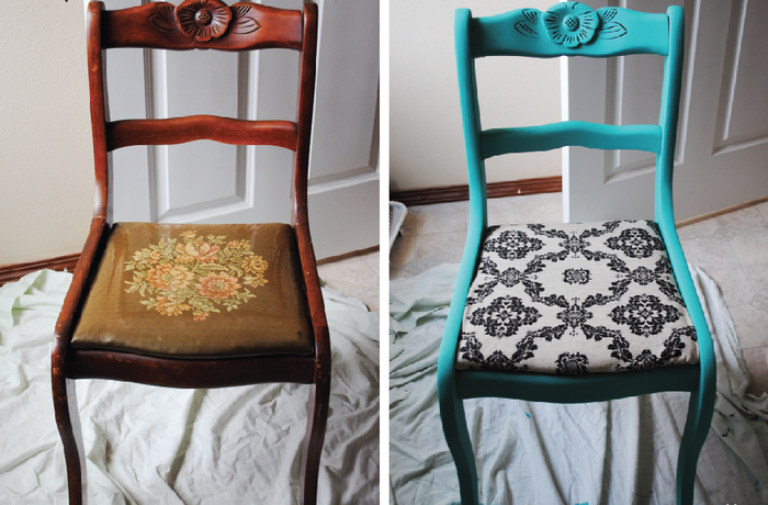 Для того, чтобы визуально освежить этот стул, его перекрасили в привлекательный бирюзовый оттенок. Обивку подобрали более контрастную и интересную, благодаря чему стул превратился в стильный предмет интерьера.